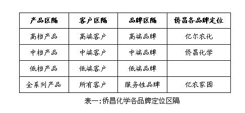 僑昌化學(xué)采用品牌群狼化策略,目前已有幾個(gè)品牌同步運(yùn)作:其“僑昌化學(xué)”定位為中端市場(chǎng),為廣大消費(fèi)提供全系列的除草解決方案;其“億爾農(nóng)化”定位為高端市場(chǎng),主要為大中型種植戶、經(jīng)濟(jì)作物等提供高端的除草植保方案;而“億農(nóng)家園”則專注于流通領(lǐng)域運(yùn)作,立足為廣大農(nóng)戶提供消費(fèi)的便利性。僑昌化學(xué)各品牌定位區(qū)隔如表一所示: