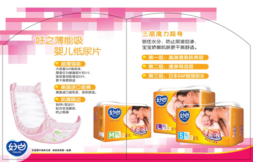 (2)四大系列:根據(jù)產(chǎn)品的特性和消費(fèi)者的需求,好之品牌系統(tǒng)規(guī)劃了三大幼兒系列產(chǎn)品品牌以及成人系列: 嬰兒紙尿褲:好之親膚棉、好之薄能吸、好之超能吸、好之成人紙尿褲、好之成人紙尿片、好之成人護(hù)理墊。完善了產(chǎn)品結(jié)構(gòu)。
