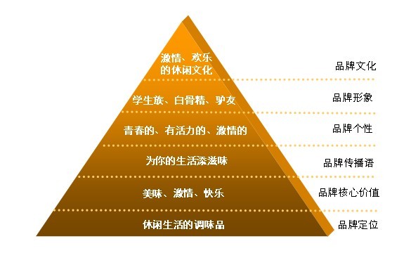 不論休閑食品企業(yè)從哪個角度定位,都是為了在消費者心中建立烙印,在消費者大腦中劃分位置。從我們的分析來看,消費者購買休閑食品,是因為需要一種休閑生活的調(diào)味品,是為了品嘗美味,尋求一種口感和精神刺激,從而釋放活力獲得快樂。而大多數(shù)企業(yè)卻忽略了這一點,有的甚至偏離了其行業(yè)本質(zhì),開開建立這一定位,將占領(lǐng)休閑食品定位的制高點,將建立一個獨特、優(yōu)勢、差異的位置,將拉近消費者的心理距離,與消費者產(chǎn)生共鳴,從而推動品牌的快速建立。從開開的品牌定位進一步延伸,建立了開開的品牌品牌核心價值、品牌傳播語、品牌個性、品牌形象、品牌文化,開開的品牌金字塔應運而生。