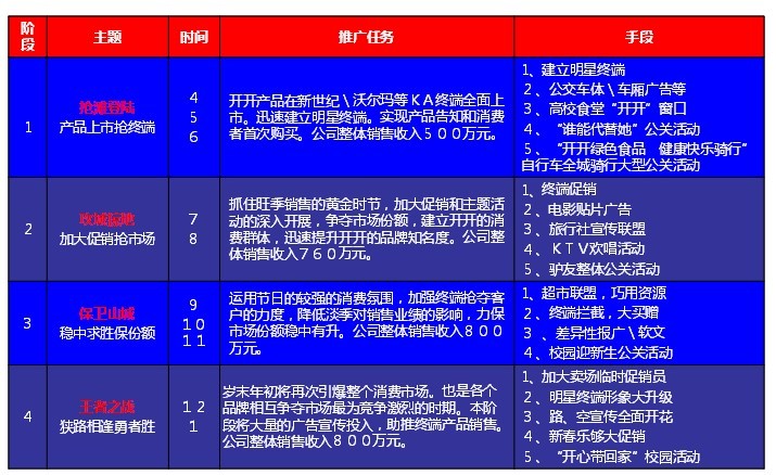 戰(zhàn)略與戰(zhàn)術(shù):乃二個全異之行動。戰(zhàn)術(shù)是關(guān)于戰(zhàn)斗諸種行動之指導法,戰(zhàn)略乃連系配合各種戰(zhàn)斗之謂。戰(zhàn)略為作戰(zhàn)之根源,即創(chuàng)意定計;戰(zhàn)術(shù)乃實行戰(zhàn)略所要求之手段。開開推廣戰(zhàn)略已經(jīng)明確,但如何進行戰(zhàn)略執(zhí)行和落地?項目組策劃開開品牌四大戰(zhàn)役,開創(chuàng)市場新格局。