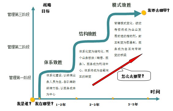項(xiàng)目組提出:針對CC北方片區(qū)市場的實(shí)際情況和企業(yè)管理情況,營銷戰(zhàn)略要按三步走:體系制勝-結(jié)構(gòu)制勝-模式制勝。首先,應(yīng)該將市場由不可控變?yōu)榭煽?,那就只能依靠體系的力量,把依托人(包括業(yè)務(wù)員和渠道渠道網(wǎng)絡(luò))轉(zhuǎn)變?yōu)橐劳畜w系,市場先抓到公司手中;其次,在可控的基礎(chǔ)上,通過業(yè)務(wù)模式的變化,將細(xì)分市場,實(shí)現(xiàn)銷售、服務(wù)三個板塊或者三種業(yè)務(wù)模式將客戶和市場拆分,增強(qiáng)企業(yè)的抗風(fēng)險性和彼此制衡,實(shí)現(xiàn)服務(wù)滲透客戶;最后,通過管理的變革,績效導(dǎo)向,實(shí)現(xiàn)各個利潤中心起頭并進(jìn),體系的力量最大化。