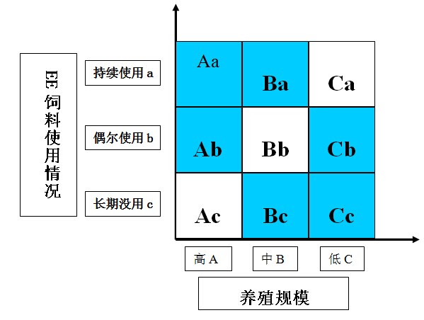 對(duì)顧客進(jìn)行分等的目的是尋找并爭(zhēng)奪重要顧客。養(yǎng)殖規(guī)模考查的指標(biāo)為現(xiàn)存欄總數(shù)。依據(jù)養(yǎng)殖規(guī)模,將養(yǎng)殖戶分為A、B、C三類,其中各類養(yǎng)殖戶養(yǎng)殖總規(guī)模分占目標(biāo)村總規(guī)模的1/3左右。預(yù)計(jì)各類養(yǎng)殖戶數(shù)分別占目標(biāo)村養(yǎng)殖總戶數(shù)的10%、30%、60%。同時(shí),依據(jù)使用EE飼料的情況將養(yǎng)殖戶分成a、b、c三級(jí)。持續(xù)使用EE飼料的忠誠(chéng)客戶,為a級(jí);偶爾使用,即一年內(nèi)使用過(guò)EE飼料的,為b級(jí);長(zhǎng)期沒(méi)用,即一年沒(méi)有使用EE飼料的,為c級(jí)。依據(jù)以上兩個(gè)指標(biāo),將目標(biāo)村全部養(yǎng)殖戶分為三等: