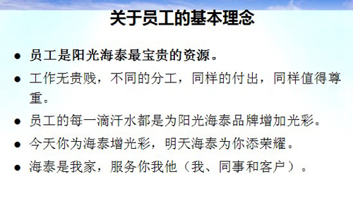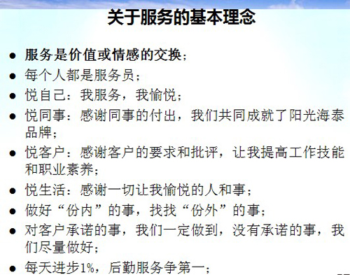 陽光海泰的基本服務(wù)理念包含客戶、員工和服務(wù)三個(gè)部分: