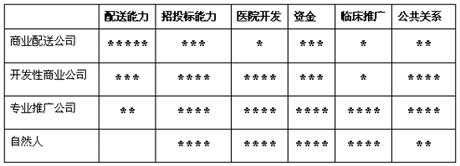 以上不同類型經(jīng)銷商在配送能力、招投標、臨床推廣、公共關(guān)系等關(guān)鍵環(huán)節(jié)各有優(yōu)缺點,如下表所示: