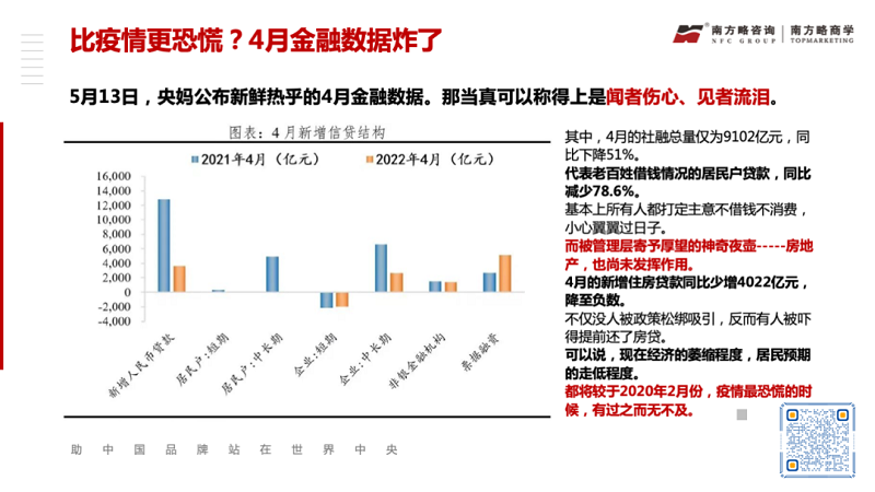 比疫情更可怕的,還有央媽公布的新鮮熱乎的4月金融數(shù)據(jù)!現(xiàn)在經(jīng)濟的萎縮程度、居民預期的走低程度,相較于2020年2月份有過之無不及。并且,很大概率上,2022年的下半年會比上半年更加難熬,無論是防疫、物價、就業(yè)、供應鏈、收入、通脹、消費等各個層面,企業(yè)和個人都需要提前做好準備,適應“疫情常態(tài)化”這一全新的社會秩序。