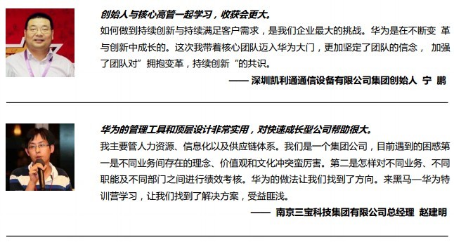 A:“黑馬—華為訓(xùn)練營(yíng)”是國(guó)內(nèi)第一家華為的官方合作機(jī)構(gòu),華為也愿意通過(guò)這個(gè)平臺(tái)第一次公開(kāi)發(fā)聲。本課程最大的特色 是其講師團(tuán)隊(duì)由服務(wù)華為多年的華 為資深管理顧問(wèn)和華為高管組成,這些教授級(jí)顧問(wèn)不僅真正懂華為 ,并參與了華為頂層架構(gòu)的設(shè)計(jì),而且善亍把華為的管理精髓萃取提煉, 講解深入淺出,同時(shí)結(jié)合華為高管的分享,有理論,有實(shí)踐,有方法 ,使您真正聽(tīng)得懂,學(xué)得到,用得上。