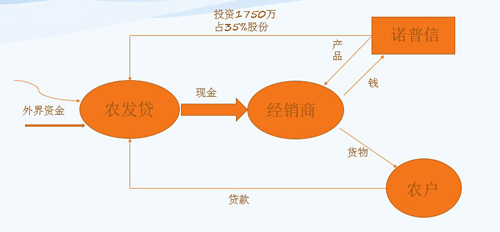 從圖上可以看出當(dāng)農(nóng)戶(hù)資金短缺時(shí),可以通過(guò)零售商或者經(jīng)銷(xiāo)商尋求農(nóng)發(fā)貸借助資金,農(nóng)發(fā)貸通過(guò)考察農(nóng)戶(hù)具體項(xiàng)目答應(yīng)貸款給農(nóng)戶(hù)。但是農(nóng)發(fā)貸并不把農(nóng)戶(hù)借來(lái)的錢(qián)直接交給農(nóng)民,而是交給經(jīng)銷(xiāo)商,經(jīng)銷(xiāo)商拿著這筆錢(qián)去購(gòu)買(mǎi)諾普信的農(nóng)資產(chǎn)品,而且是只能被允許購(gòu)買(mǎi)諾普信的產(chǎn)品,然后經(jīng)銷(xiāo)商再把買(mǎi)來(lái)的諾普信的貨物交給農(nóng)戶(hù)并施用。就這樣諾普信通過(guò)這一過(guò)程重構(gòu)供需關(guān)系,通過(guò)互聯(lián)網(wǎng)的特性集合并利用了社會(huì)上的閑散資源形成一塊新的供應(yīng),不僅幫助解決了客戶(hù)的資金需求問(wèn)題,同時(shí)還幫助完成了自己的產(chǎn)品銷(xiāo)售問(wèn)題。嗯嗯,不錯(cuò)不錯(cuò),看來(lái)以后找人借錢(qián)有著落了。